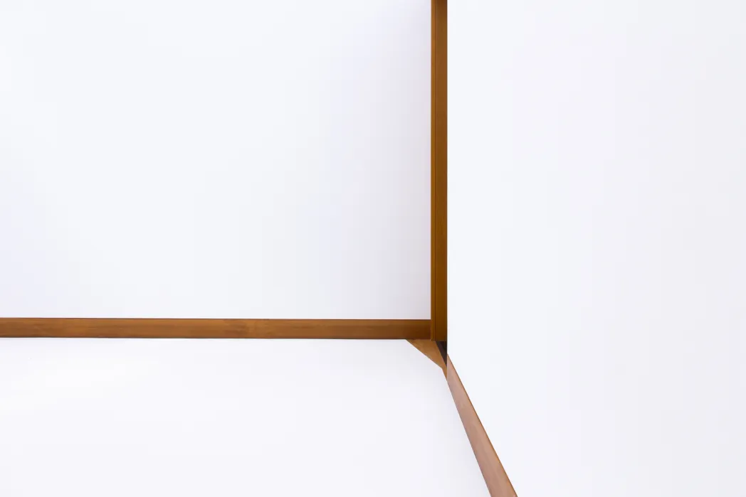 In den hohen Galerieräumen im Obergeschoss hat Kretschmann in minuziöser Arbeit weißen Pigmentstaub auf den Parkettboden gesiebt. Entstanden ist so eine geometrische Bodenarbeit ausgerichtet am Grundriss der Räume, leicht gekippt in den Raum gezeichnet. Durch diese Verschiebung der Fläche wird dem Betrachter ein schmaler Bereich gewährt, über den er den Raum betreten und die strahlend weiße Fläche betrachten kann. Gleichermaßen entstehen so auch dramatische Linien, die die Geometrie der Räume zerschneiden. Das durchdringende Weiß der Bodenfläche hat eine intensive Wirkung: gleichzeitig das gesamte Licht der hohen Räume schluckend wie auch reflektierend, zieht die Arbeit den Betrachter in ihren Bann. Der Raum als solcher löst sich auf, auf einmal gibt es die Trennung von Boden, Decke und Wänden nicht mehr, wir sehen nur noch Flächen. Kretschmann macht das Gewaltige dieser Räume physisch erfahrbar. (…)