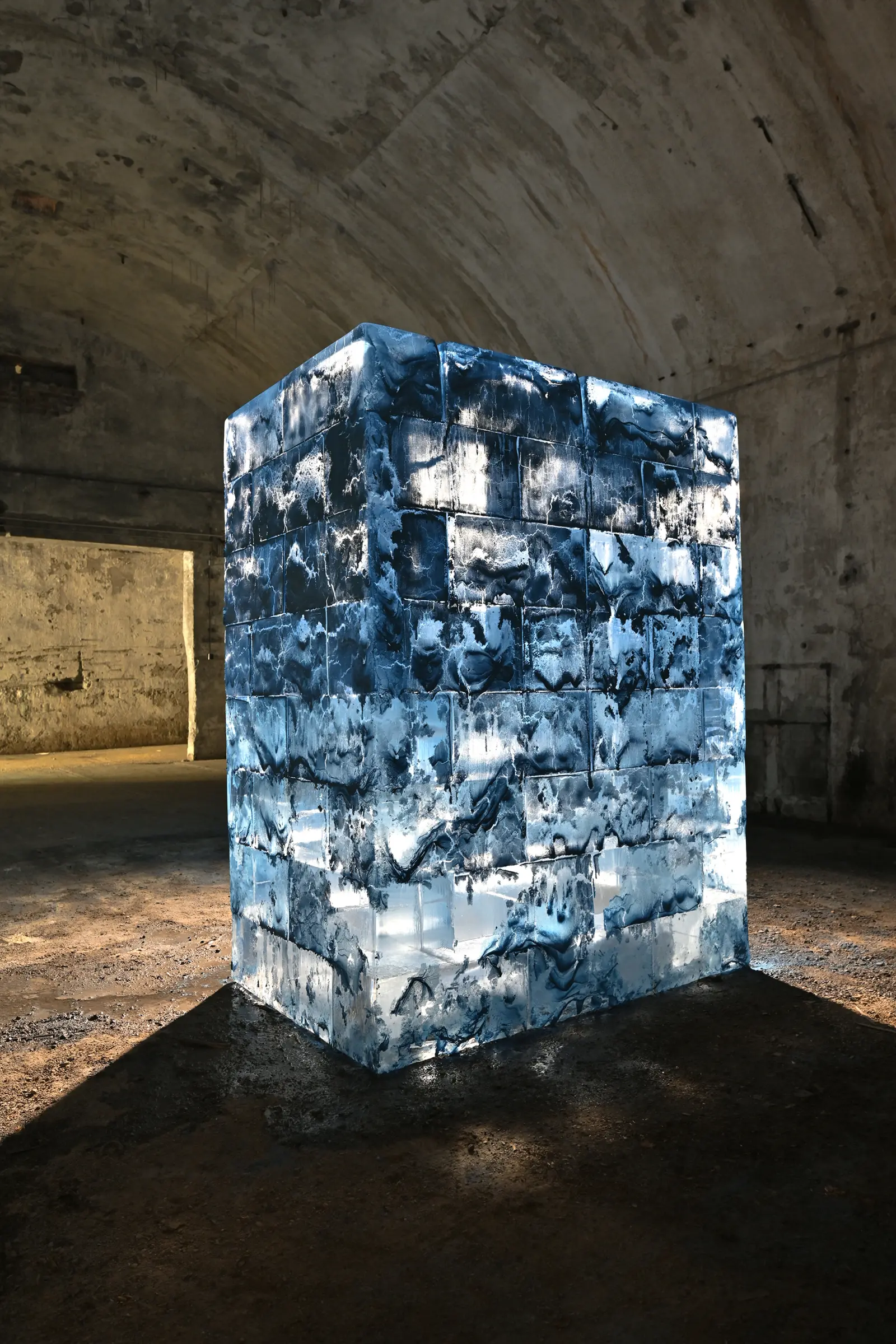 Im ehemaligen Eiskeller der Inselbrauerei Lindau wird eine Installation Eisblöcken realisiert, die mit Lackspray überzogen sind. An diesem historischen Ort, der einst zur Lagerung von Natureis diente, verlangsamt die Raumtemperatur den Schmelzprozess der Eisarbeit.