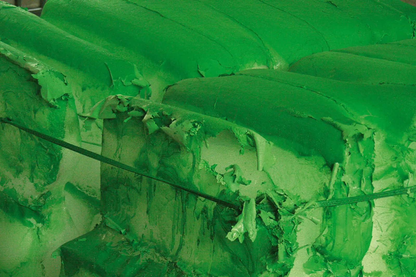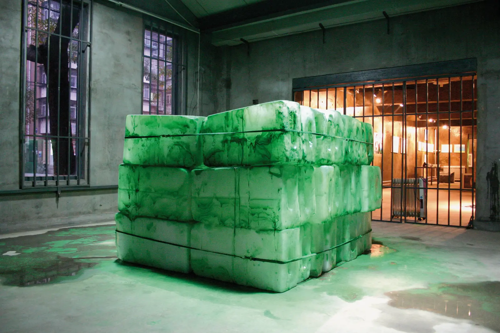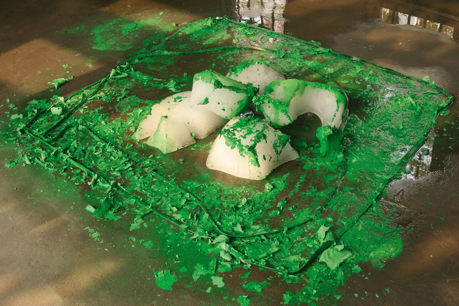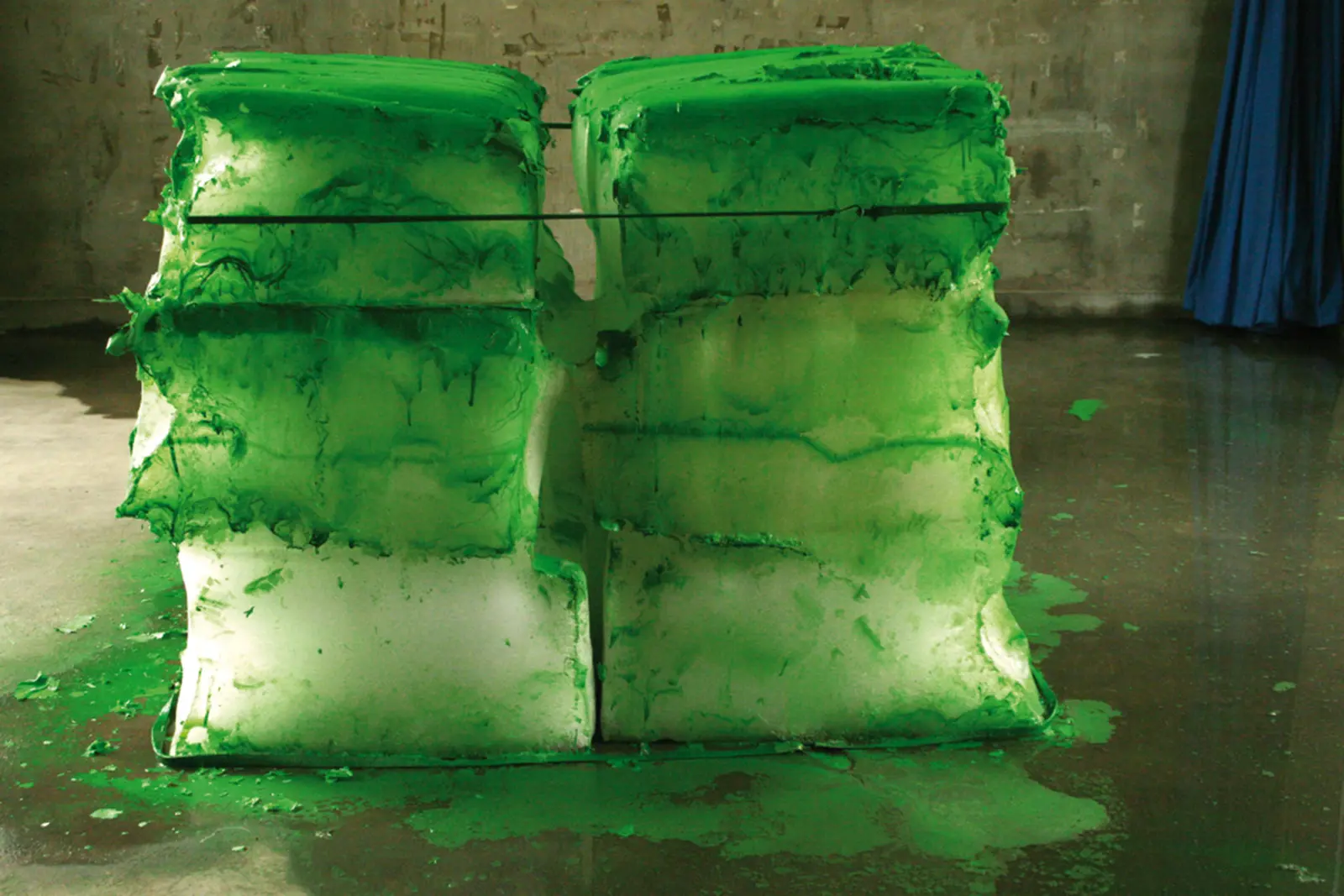 48 blocks of ice are being bought at the local market in Tianjin and transported to the exhibition space. Before the exhibition opening, the blocks of ice are being coated with spray paint. The ice melts, the liquid and particles of the dried color disperse partly out of the exhibition space or remain within the form, which is defined by the remaining lashing straps.