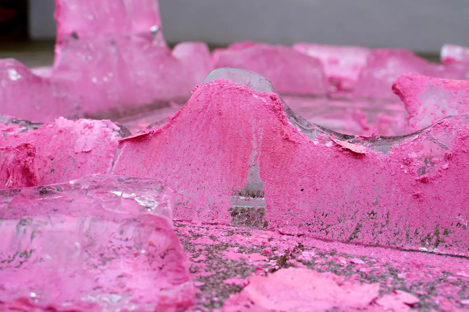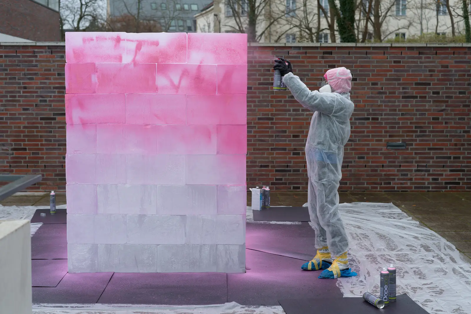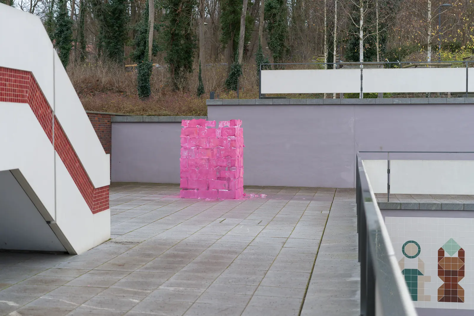 On the southern terrace of the MINSK Kunsthaus in Potsdam, BING (ROSE) is installed as a temporary work. Developed since 2007 in various contexts, the BING series works with ice and color to mark sites and render existing inscriptions visible. A cuboid volume of industrially cut ice blocks is sprayed on site with luminous pink paint. As the ice melts, the paint particles detach and settle on the ground. With the disappearance of the ice, a temporary trace remains. The terrace is located above historic ice cellars once used for cooling beer. This site-specific constellation establishes a material relation to the work. As the sculptural body liquefies, the relationships between color, surface, and architecture shift.