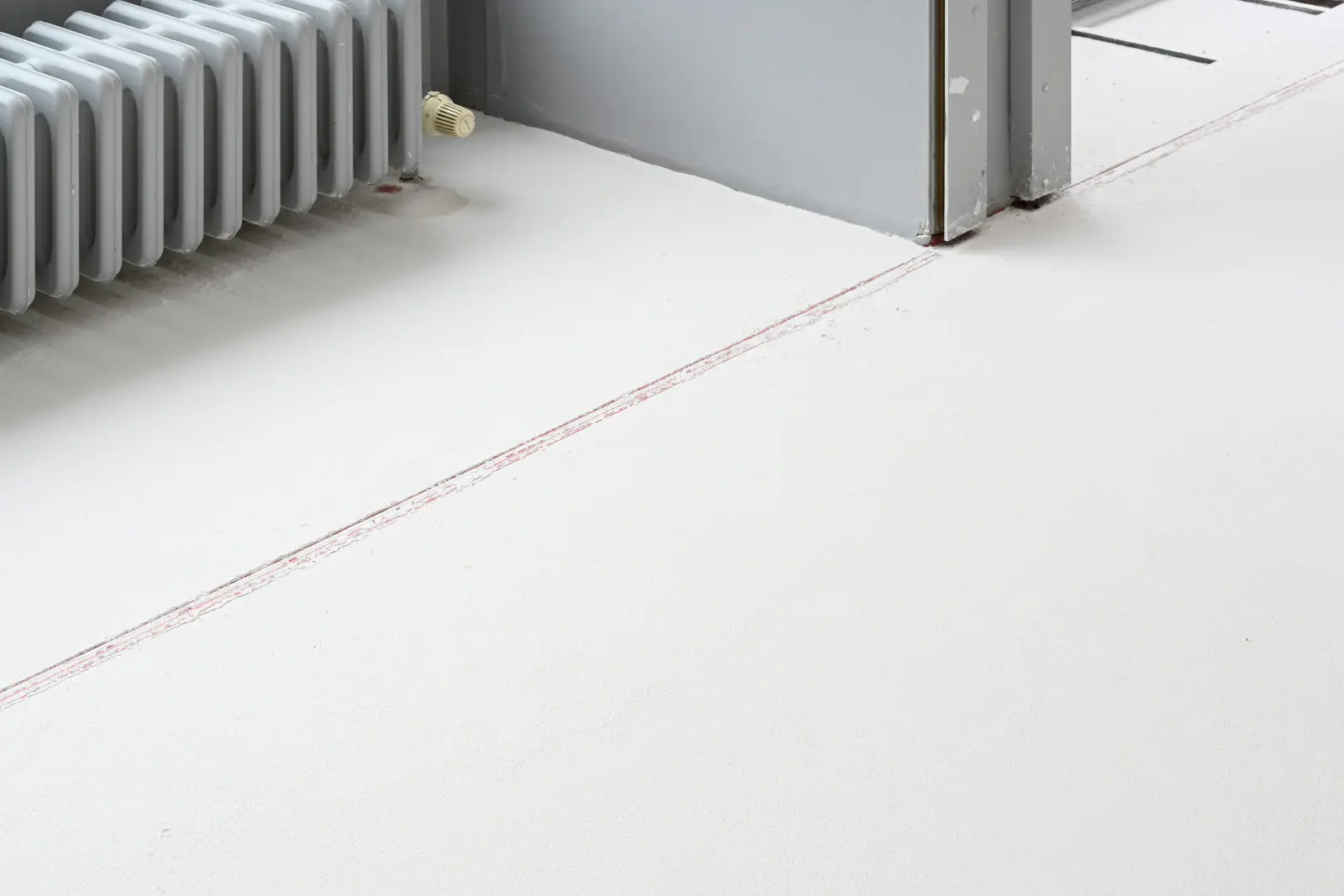 Mit ihrer streng geometrischen Form und verletzlichen Oberfläche ist die Bodenarbeit Blank eine direkte Reaktion auf die Oberflächen und Dimensionen des Ausstellungsraumes. Im Verlauf der Ausstellung speichert die gesiebte Fläche Handlungen und Dinge, die sich scheinbar unbeobachtet Tag und Nacht im Raum bewegen, wie ein Detektor der vergehenden Zeit.