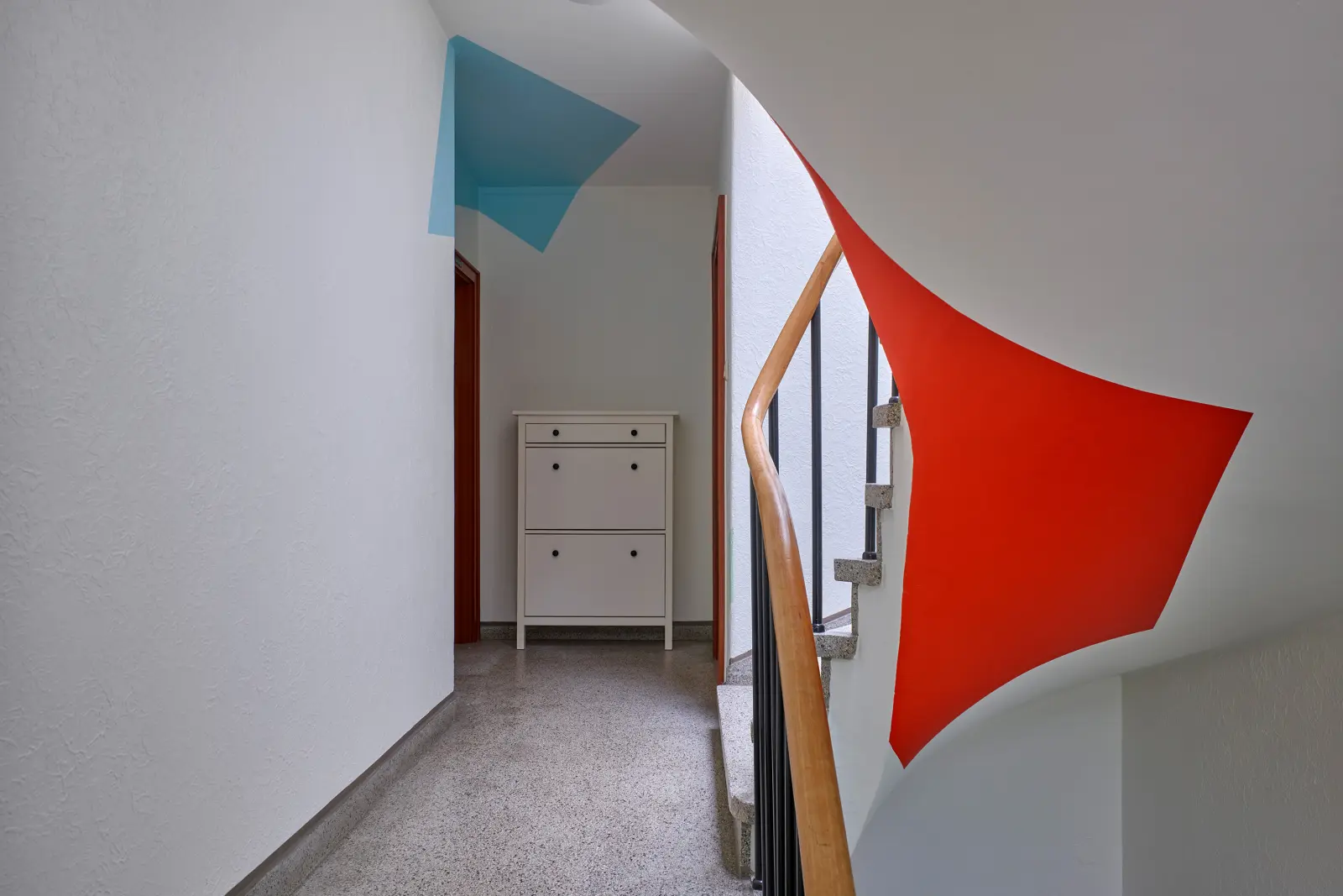 Die Arbeit besteht aus einer vielteiligen Konstellation monochromer Farbflächen auf weißen Grund. Die sechs Farbtöne sind einer Farbpalette aus den 1950er Jahren entnommen, der Entstehungszeit des Gebäudes. Die Farbflächen sind projizierte Formen auf Wand und Decke des Treppenhauses, die die Bewegung des Blicks und des Körpers beim Gehen durch den Raum motivieren. In der Erkundung des Treppenhauses anhand dieser Schlüsselstellen ist der Bewegungsmoment der Betrachter*innen benannt: In der Arbeit wird die tägliche Routine, die Bewegung durch das Treppenhaus, selbst bildlich umgesetzt.