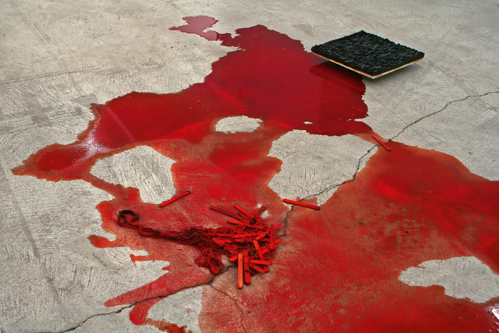 The melt-liquid of several ice lollies runs underneath an apple cake on castors that was baked by the artist’s mother until it carbonised into a black square.