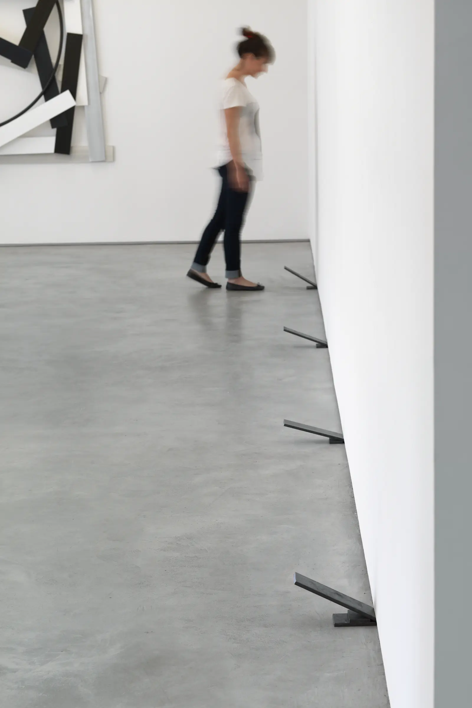 Steel wedges are placed in the shadow gap between gallery wall and floor, alluding to the possibility of cracking open the wall both in its physical condition as a wall and in its function as a hanging space within a white cube.