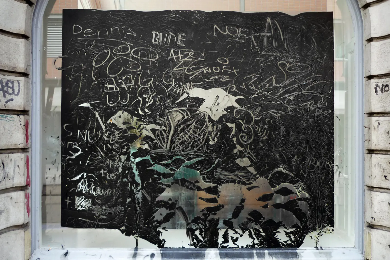 Indem außen schwarzes und innen transparentes Lederfett aufgetragen wird, wird eine Fensterscheibe zum Träger eines zweiseitigen Bildfeldes. Auf der Straßenseite nimmt das Lederfett Staub- und Schmutzpartikel oder auch herumfliegende Pollen auf und verliert dadurch die eingangs klar definierte Form. Der Transformationsprozess lädt Passanten offensichtlich zu Eingriffen ein.