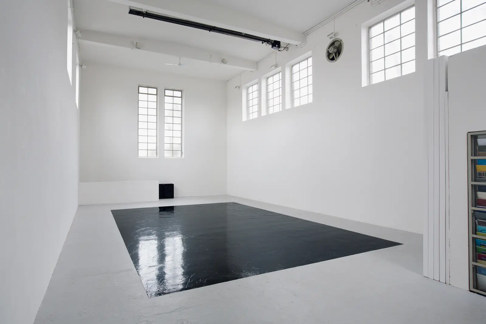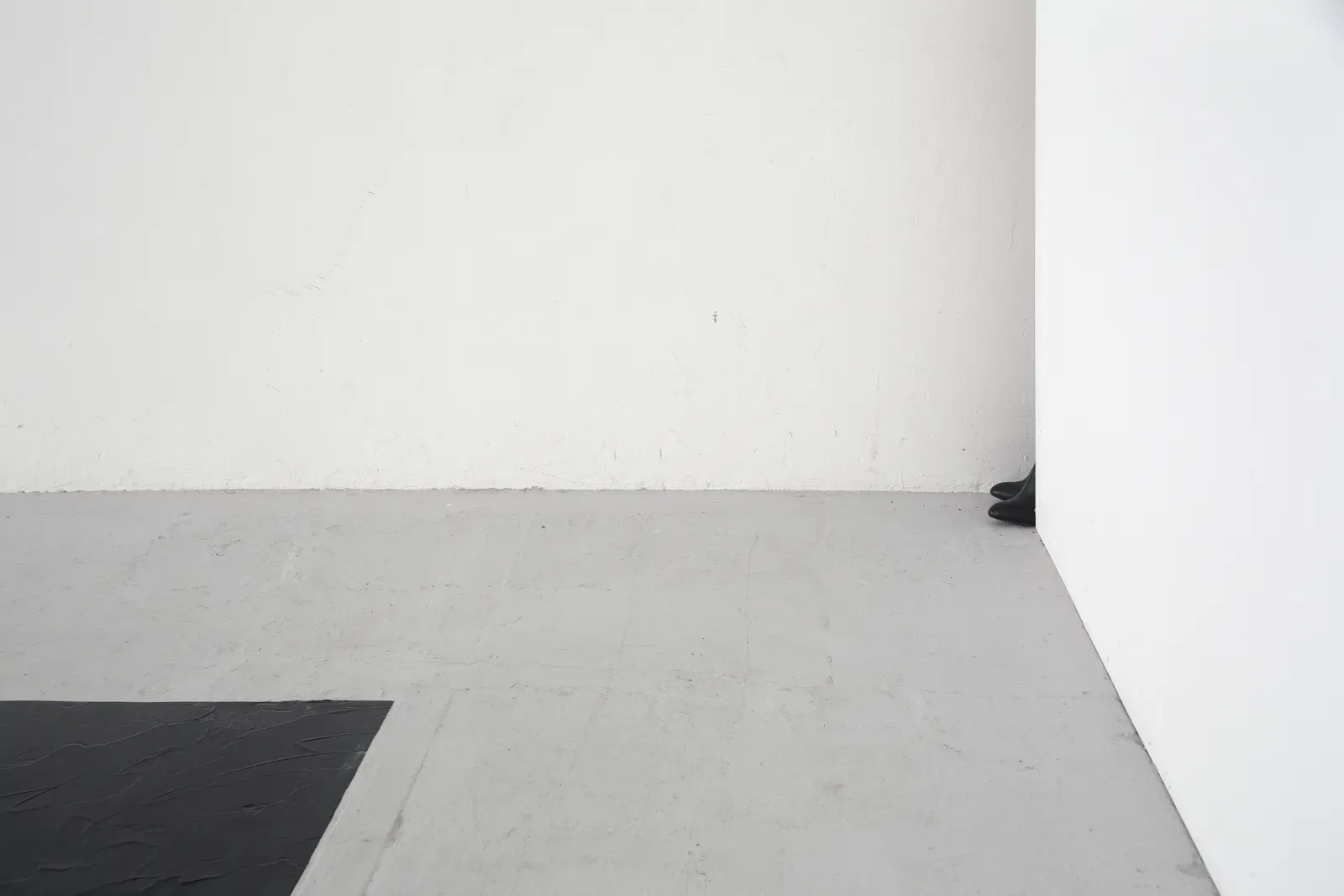 A colour field of black dubbin is laid out on the floor of the exhibition space. The artist’s shoes, treated with the same dubbin, are placed in a corner niche. The noise of the heating system is supplemented by the electronically amplified recording of the industrial clock hanging by the entrance to the exhibition space.