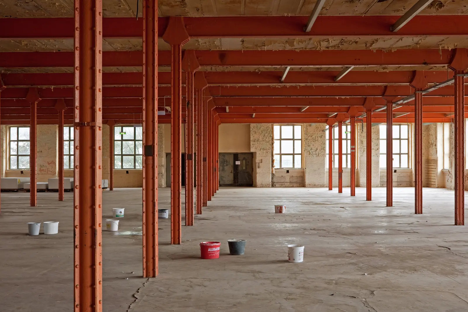 The starting point of the work is a specific situation in HALLE 14 at the Baumwollspinnerei in Leipzig. Ice-cream from a nearby ecological ice-cream shop is thrown into a defined range of the exhibition surface, demarcating an image field. Posters are hung on a partition wall behind this area, they shows details of the storey beneath the exhibition space, into which the melted ice-cream will drip through the ceiling. During the exhibition opening a city opening ceremony takes place on the building's roof, on the occasion of the renovation of the roof of HALLE 14, which was necessary due to water damage.