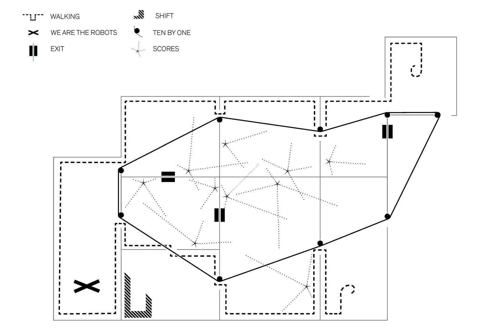 Ein neues Ensemble von Werken kodiert den Ausstellungsraum radikal um. Installationen, Klang- und Videoarbeiten sowie Performances und kontextspezifische Interventionen, die für die gesamte räumliche Struktur konzipiert wurden, erstrecken sich dabei über einzelne Räume hinaus. Kleine und große, laute und leise Ereignisse überschneiden und transformieren sich, sodass die Architektur zu einem lebendigen, übergreifenden Gefüge wird, das sich als vielschichtige choreografische Erfahrung entfaltet.