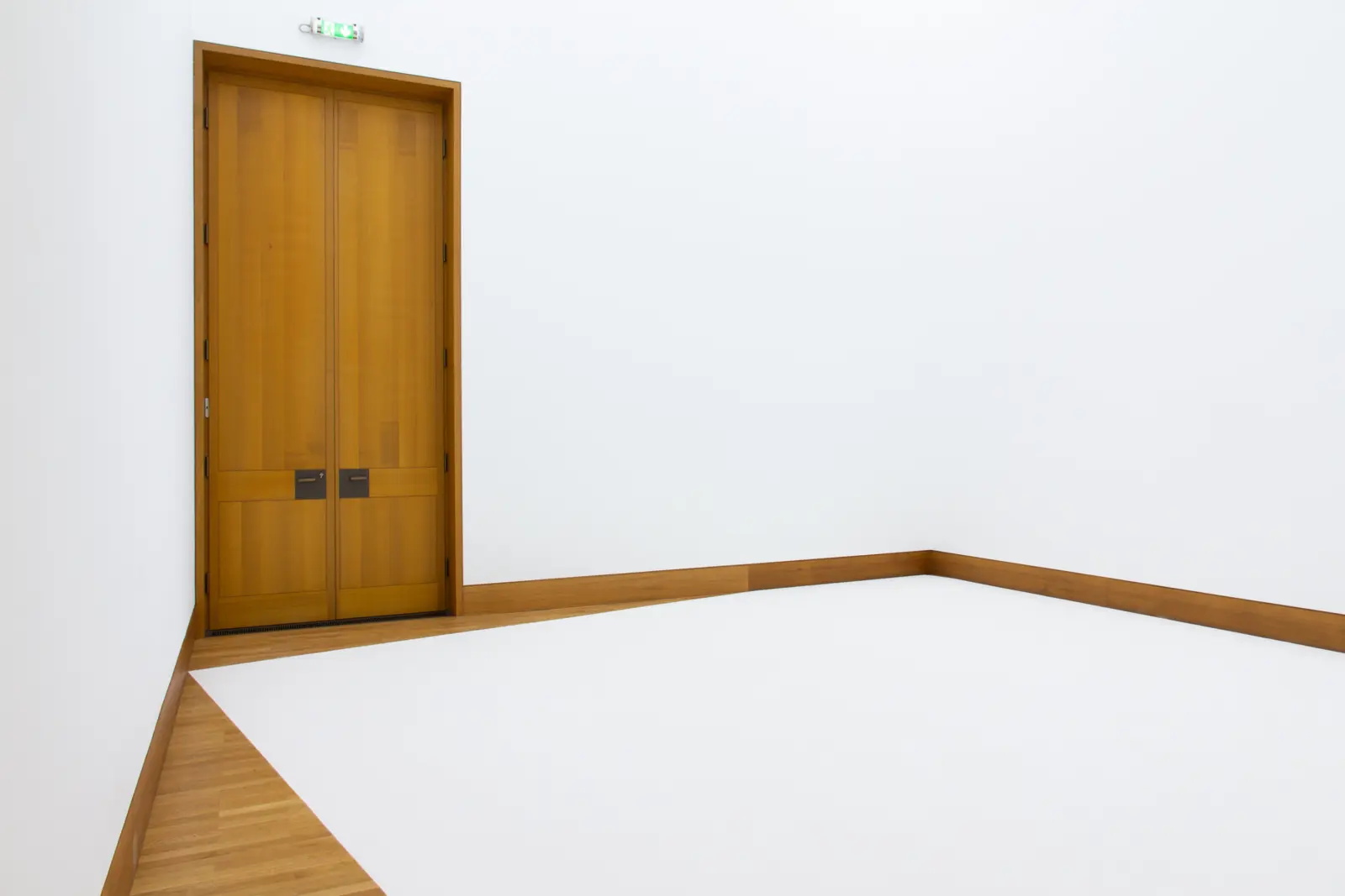 In den hohen Galerieräumen im Obergeschoss hat Kretschmann in minuziöser Arbeit weißen Pigmentstaub auf den Parkettboden gesiebt. Entstanden ist so eine geometrische Bodenarbeit ausgerichtet am Grundriss der Räume, leicht gekippt in den Raum gezeichnet. Durch diese Verschiebung der Fläche wird dem Betrachter ein schmaler Bereich gewährt, über den er den Raum betreten und die strahlend weiße Fläche betrachten kann. Gleichermaßen entstehen so auch dramatische Linien, die die Geometrie der Räume zerschneiden. Das durchdringende Weiß der Bodenfläche hat eine intensive Wirkung: gleichzeitig das gesamte Licht der hohen Räume schluckend wie auch reflektierend, zieht die Arbeit den Betrachter in ihren Bann. Der Raum als solcher löst sich auf, auf einmal gibt es die Trennung von Boden, Decke und Wänden nicht mehr, wir sehen nur noch Flächen. Kretschmann macht das Gewaltige dieser Räume physisch erfahrbar. (…)