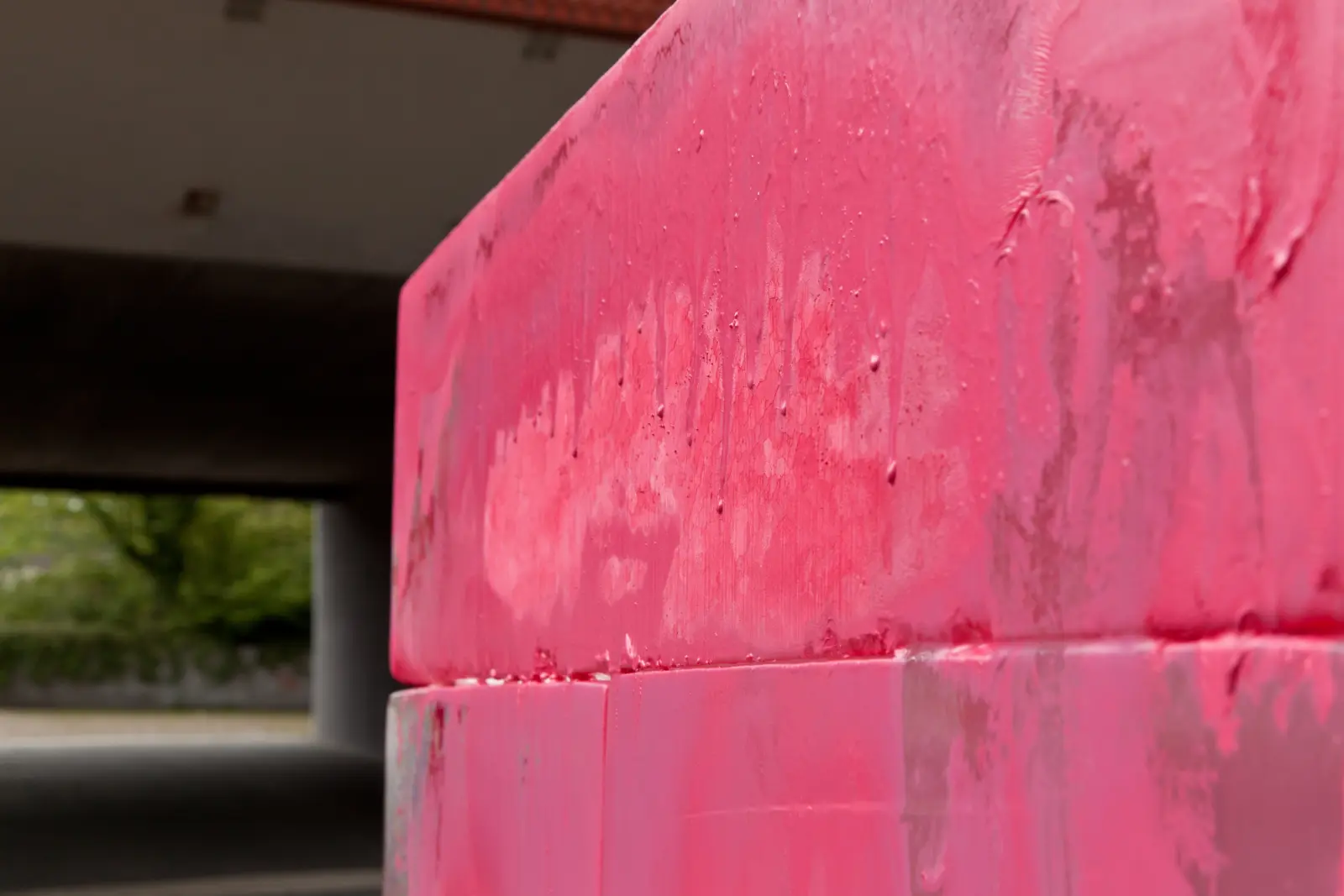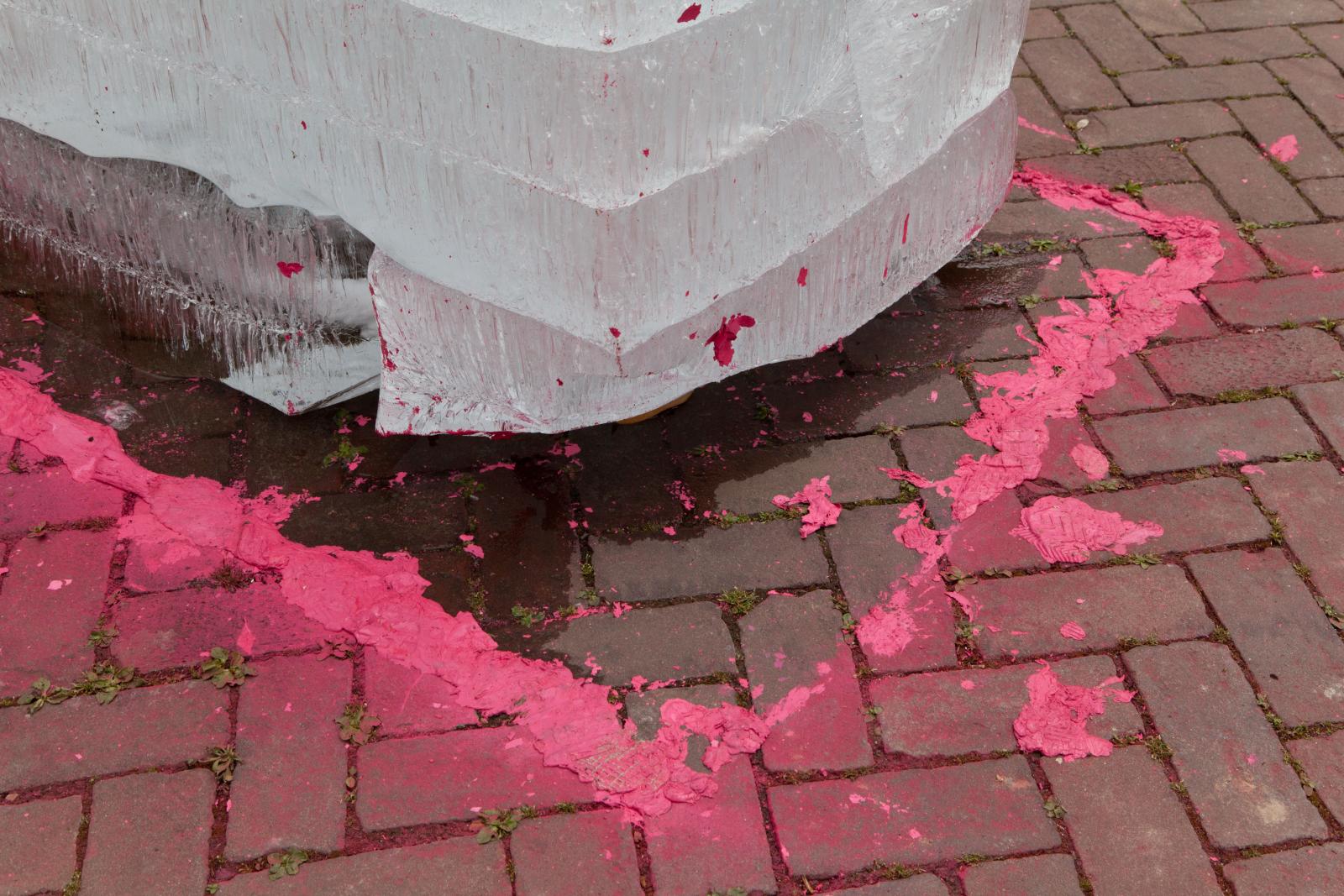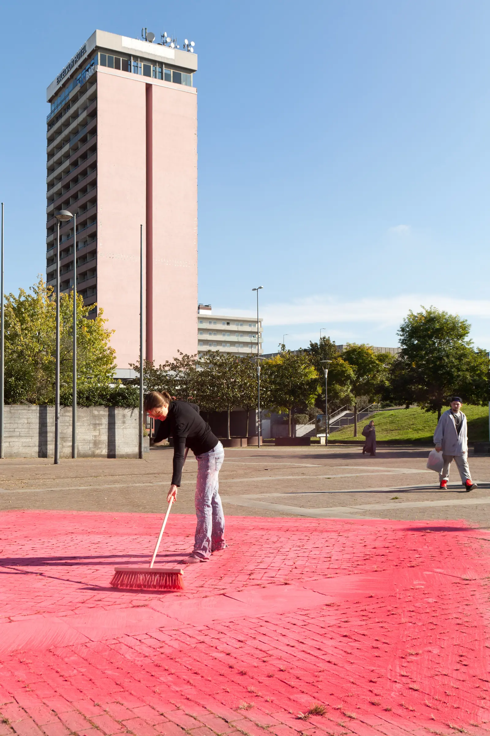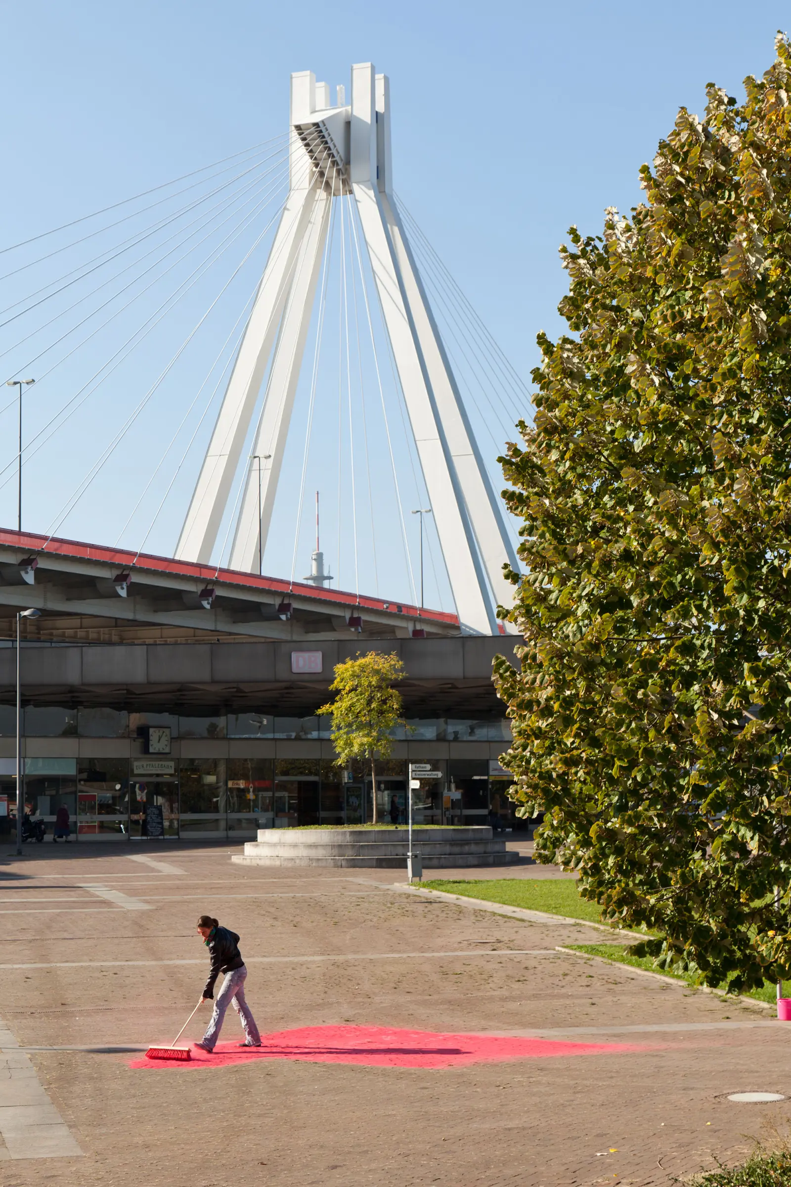 The work consists of six temporary interventions, seeming like daily events, situated in the urban space around Ludwigshafen‘s main station. The objects and materials she uses allude to their urban context and repeatedly show the colour pink. They appear solitarily in their attributed space, relate to architectural elements or are embedded in human interactions.