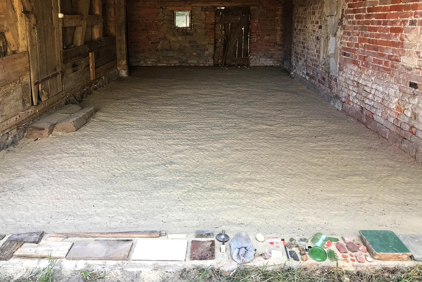 Für ihre Raumintervention bei der Land(Schafft)Kunst-Biennale in Neuwerder hat Schirin Kretschmann den Sandboden eines alten Schuppens systematisch nach Fundstücken durchsucht. Was sie fand, hat sie an der Schwelle des Schuppens geordnet und die Sandoberfläche des Bodens anschließend mit ihren Handabdrücken in ein gleichmäßiges Relief verwandelt.