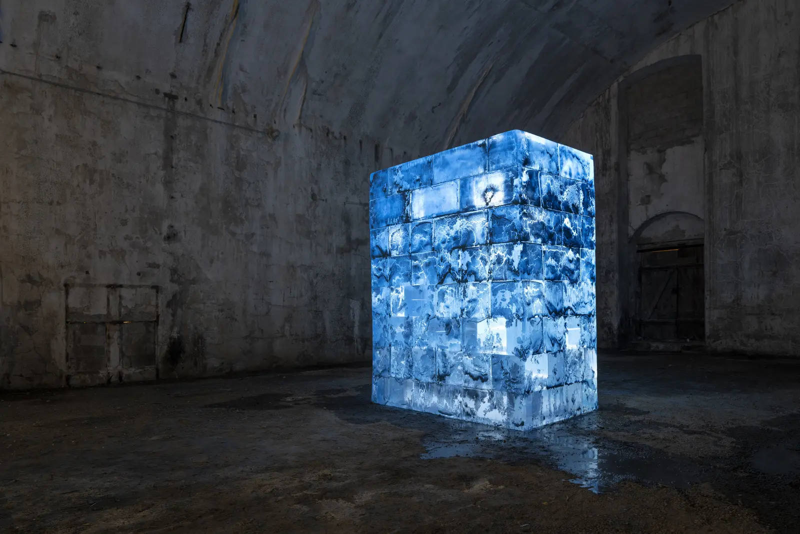 Im ehemaligen Eiskeller der Inselbrauerei Lindau wird eine Installation Eisblöcken realisiert, die mit Lackspray überzogen sind. An diesem historischen Ort, der einst zur Lagerung von Natureis diente, verlangsamt die Raumtemperatur den Schmelzprozess der Eisarbeit.