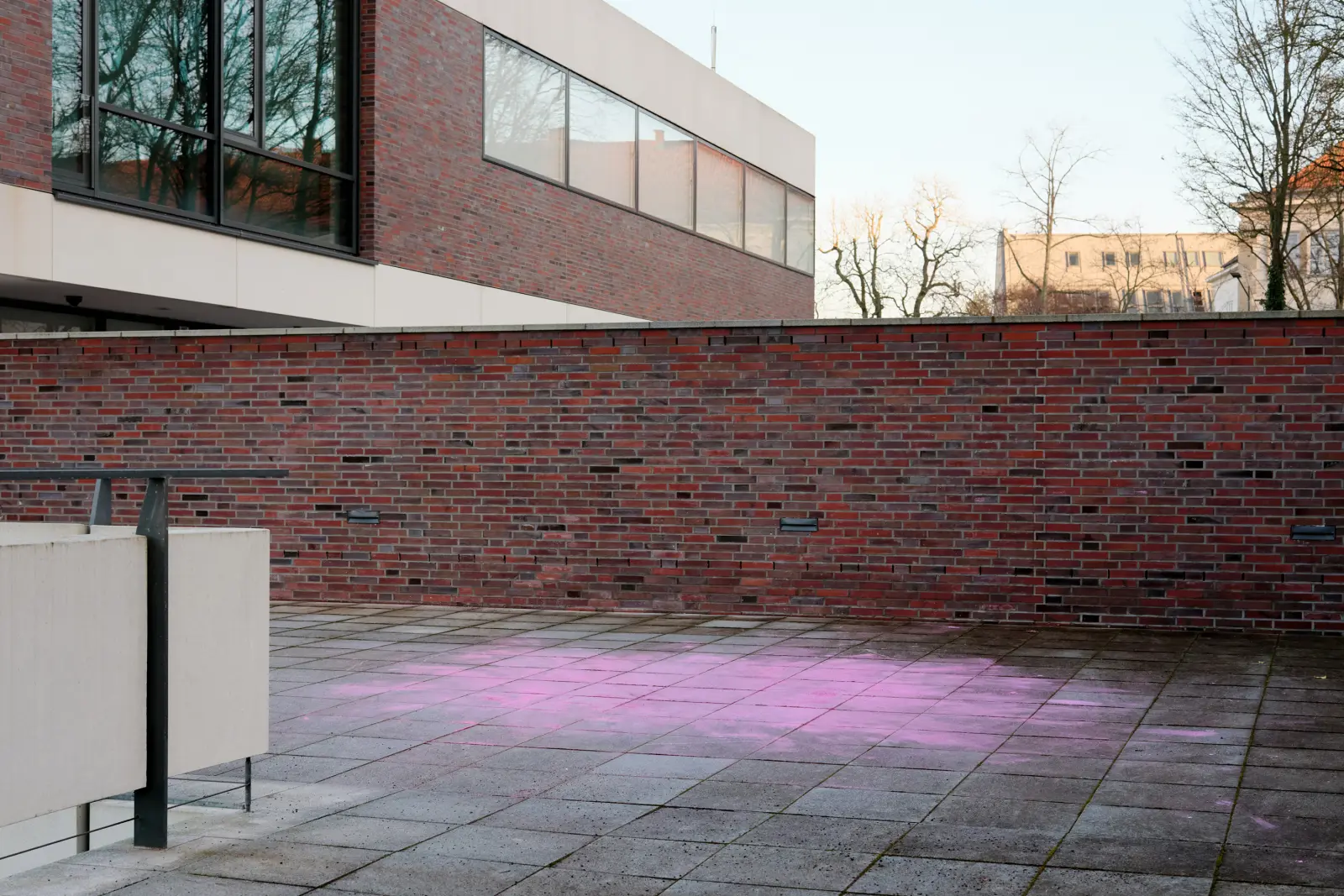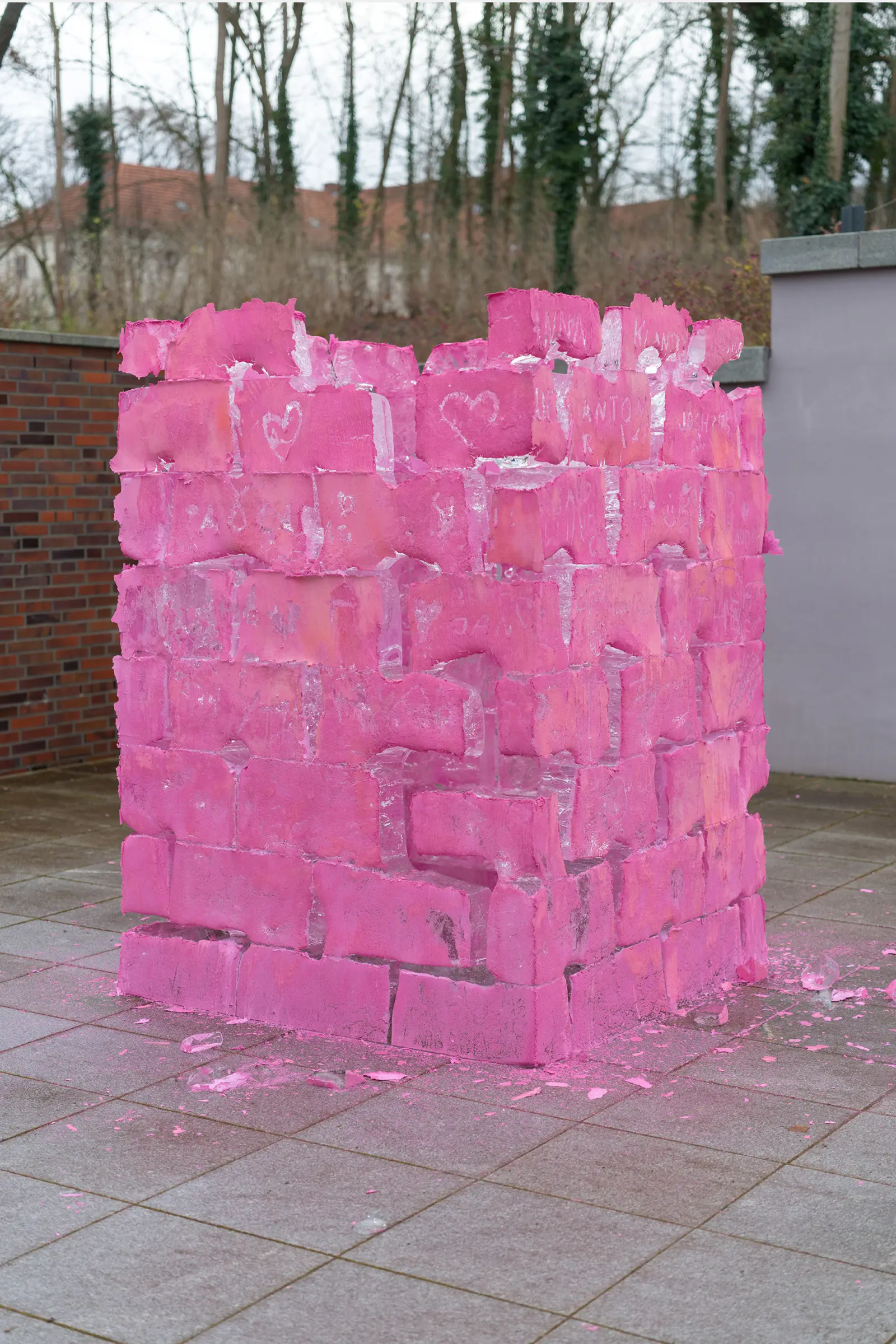 On the southern terrace of the MINSK Kunsthaus in Potsdam, BING (ROSE) is installed as a temporary work. Developed since 2007 in various contexts, the BING series works with ice and color to mark sites and render existing inscriptions visible. A cuboid volume of industrially cut ice blocks is sprayed on site with luminous pink paint. As the ice melts, the paint particles detach and settle on the ground. With the disappearance of the ice, a temporary trace remains. The terrace is located above historic ice cellars once used for cooling beer. This site-specific constellation establishes a material relation to the work. As the sculptural body liquefies, the relationships between color, surface, and architecture shift.