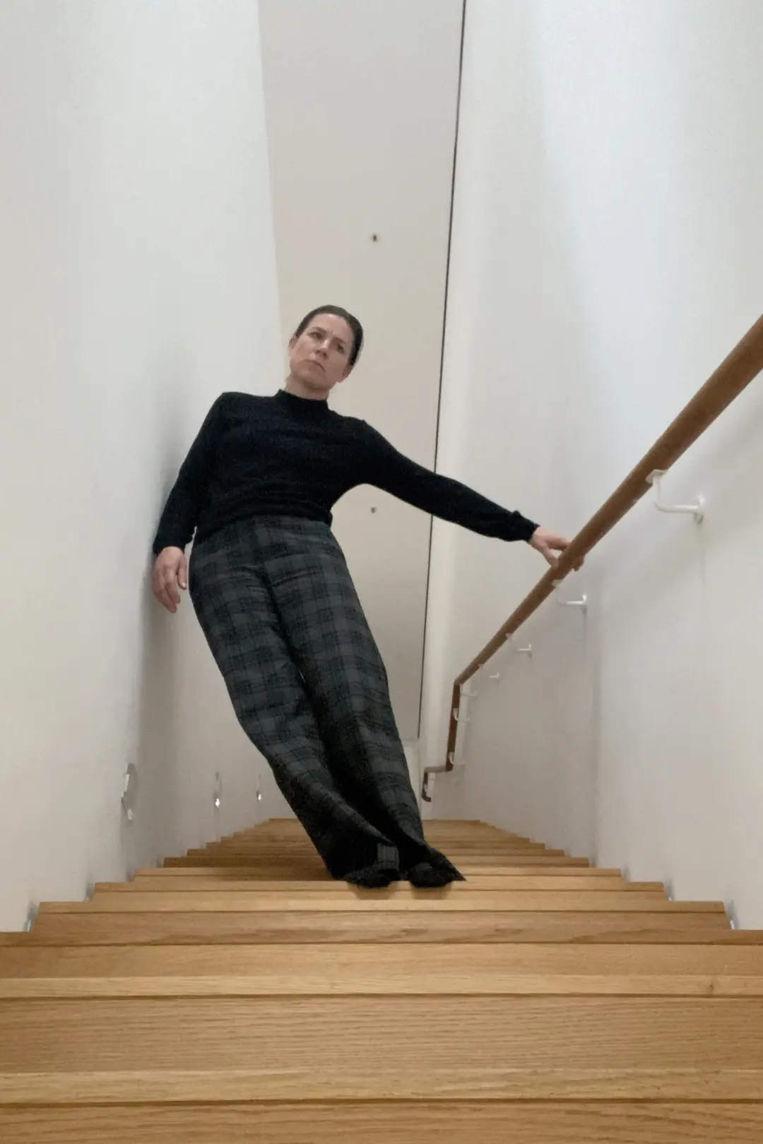 In dem schmalen Treppengang des DG Kunstraums entsteht eine ortsbezogene Videoarbeit. Hierfür wird die Kamera am Fuß der Treppe platziert. Aufgezeichnet wird, wie sich die Künstlerin mit einer Hand am Treppengeländer die Treppe heruntergeht. Die auf den ersten Blick alltägliche Bewegung erscheint instabil, die Eigenbalance des Körpers scheint angegriffen – anders als bei den stabilen Bewegungsfiguren der kunsthistorischen Vorläufern, die sich diesem Motiv gewidmet haben (Eadweard Muybridge, Marcel Duchamp, Gerhard Richter). Die Bewegung erscheint ambigue, und kippt zwischen dem Eindruck von Haltlosigkeit des Körpers und dem prekären Halt an dem Geländer. Das Video wird am oberen Absatz der Treppe präsentiert.