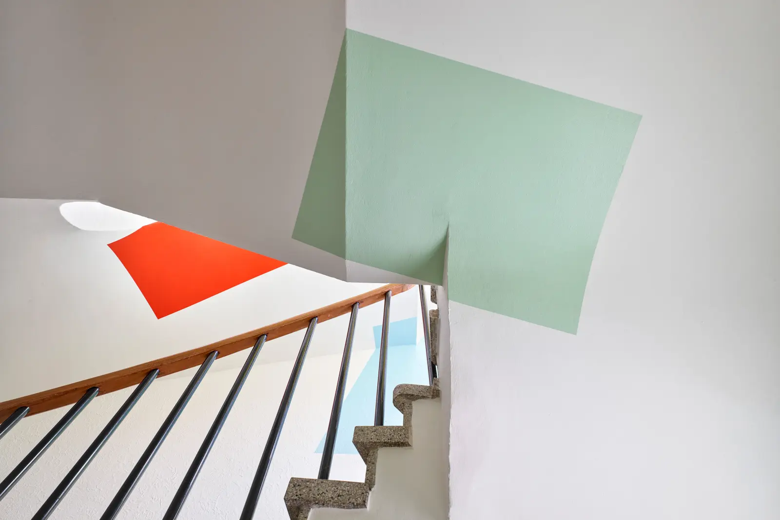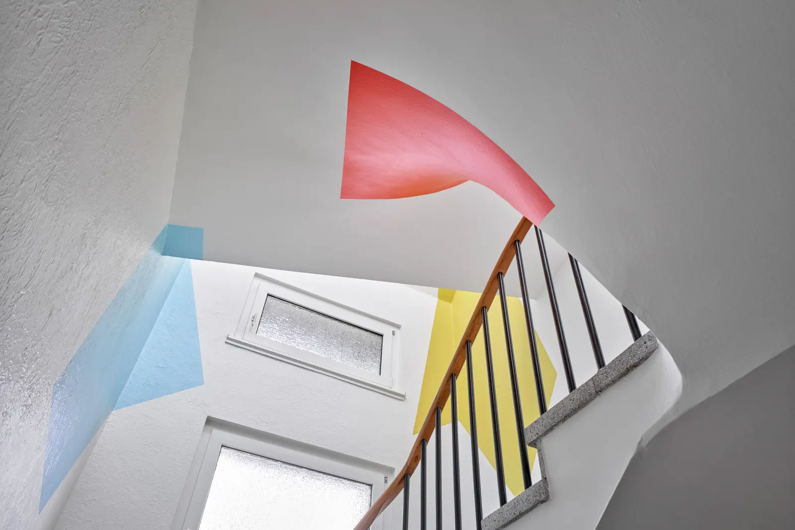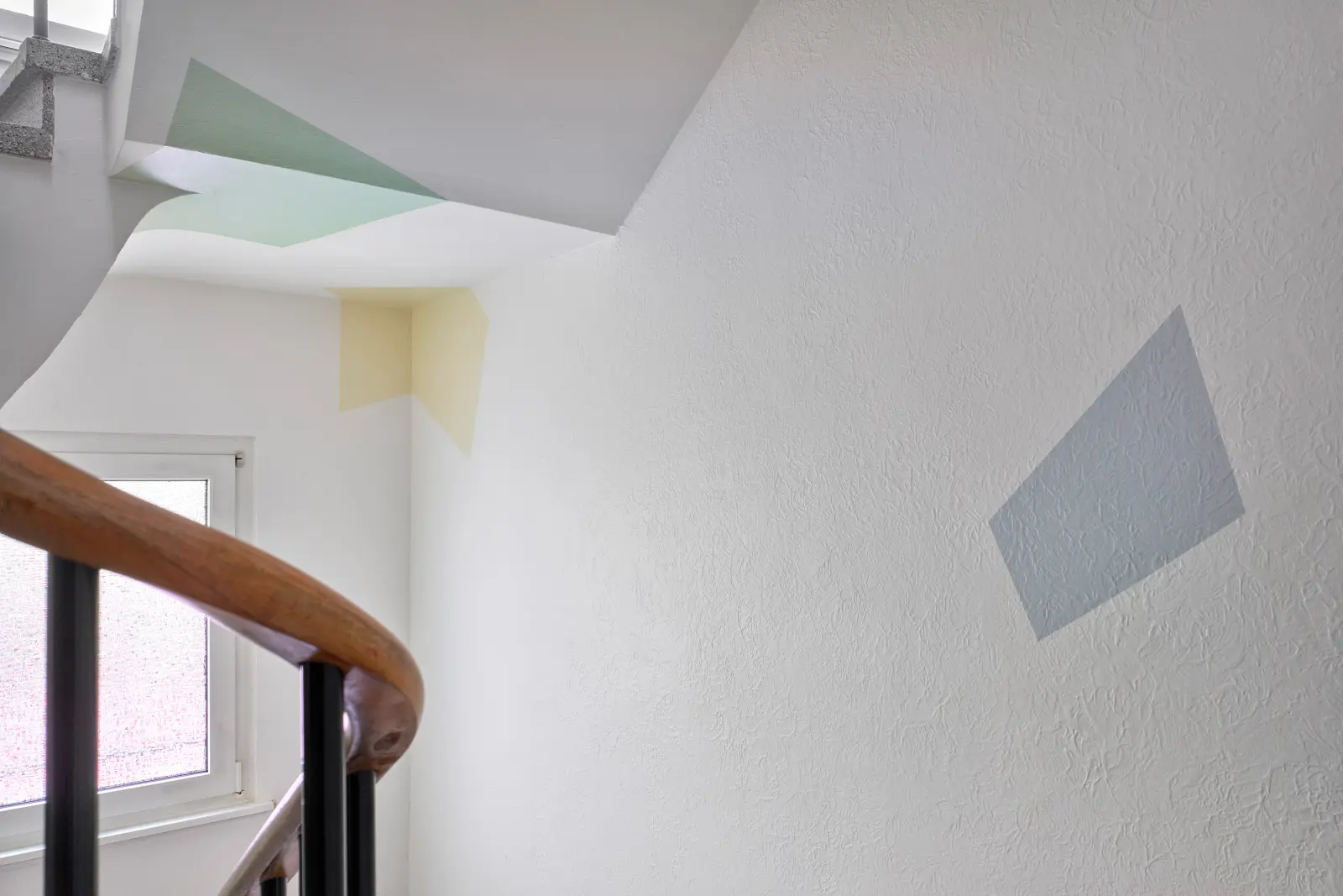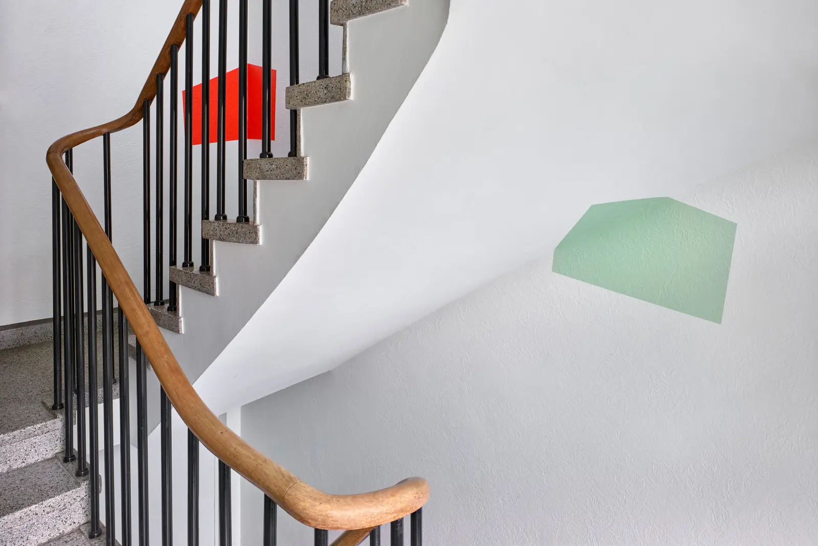 Die Arbeit besteht aus einer vielteiligen Konstellation monochromer Farbflächen auf weißen Grund. Die sechs Farbtöne sind einer Farbpalette aus den 1950er Jahren entnommen, der Entstehungszeit des Gebäudes. Die Farbflächen sind projizierte Formen auf Wand und Decke des Treppenhauses, die die Bewegung des Blicks und des Körpers beim Gehen durch den Raum motivieren. In der Erkundung des Treppenhauses anhand dieser Schlüsselstellen ist der Bewegungsmoment der Betrachter*innen benannt: In der Arbeit wird die tägliche Routine, die Bewegung durch das Treppenhaus, selbst bildlich umgesetzt.