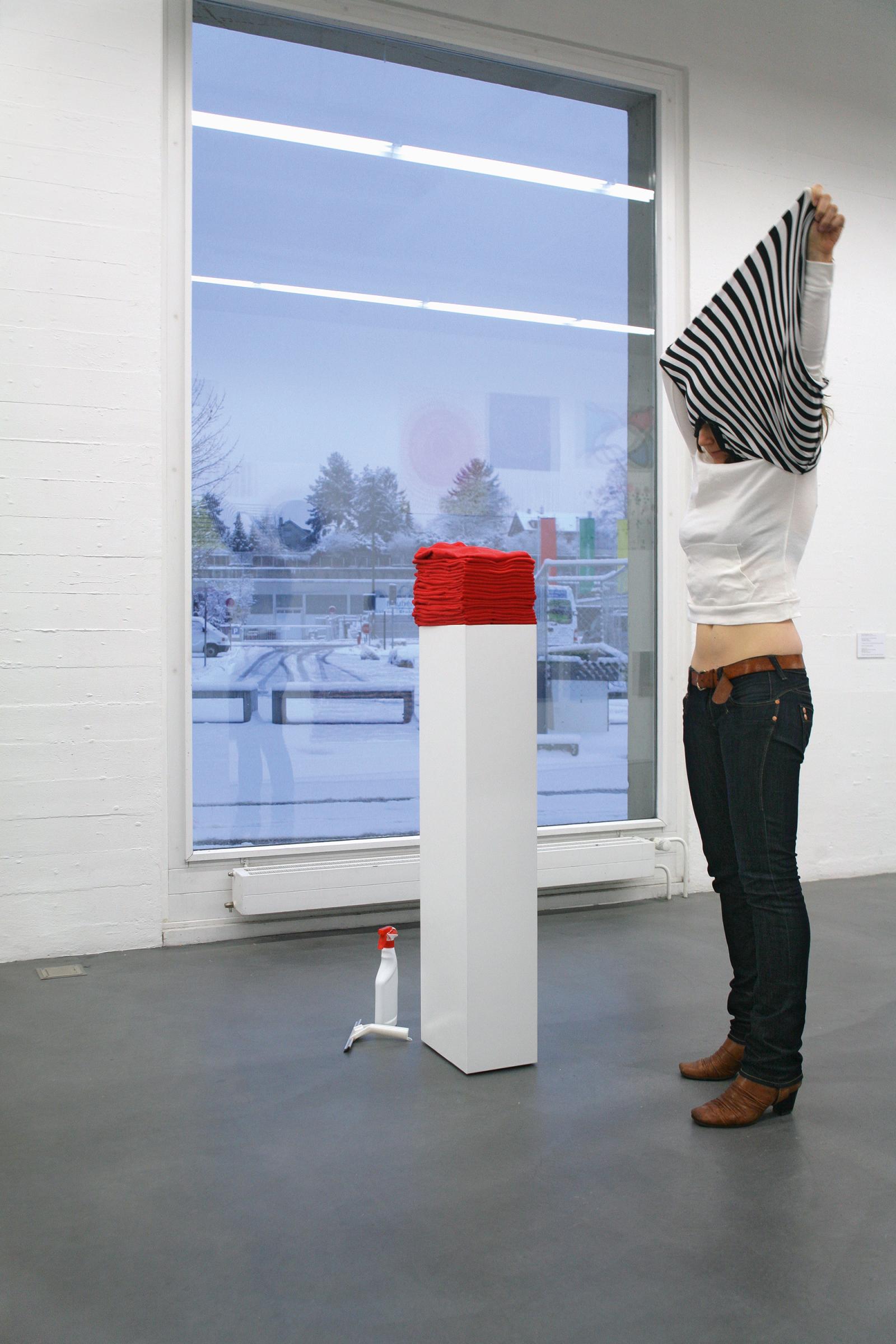 Close to the glass façade of the exhibition space of the Kunsthaus Baselland 20 identical red T-Shirts are stacked on a plinth. During the opening, and at certain times in the process of the exhibition, the shirt worn by the artist is exchanged for one the red T-Shirts in the showroom. Her own clothing is used as cleaning rags for a performance, in which all red cars parked in the visible lots of the Kunsthaus Baselland at that point of time are polished with glass cleaner. Subsequently, the article of clothing used as a cleaning rag is brought back into the showroom and thrown beside the stack of T-shirts. The artist keeps the red shirt on, thus transferring it into her household. This action is repeated several times a week, its traces visible in the exhibition space in the quantitative decline of the red T-shirts and the increase of the used articles of clothing.