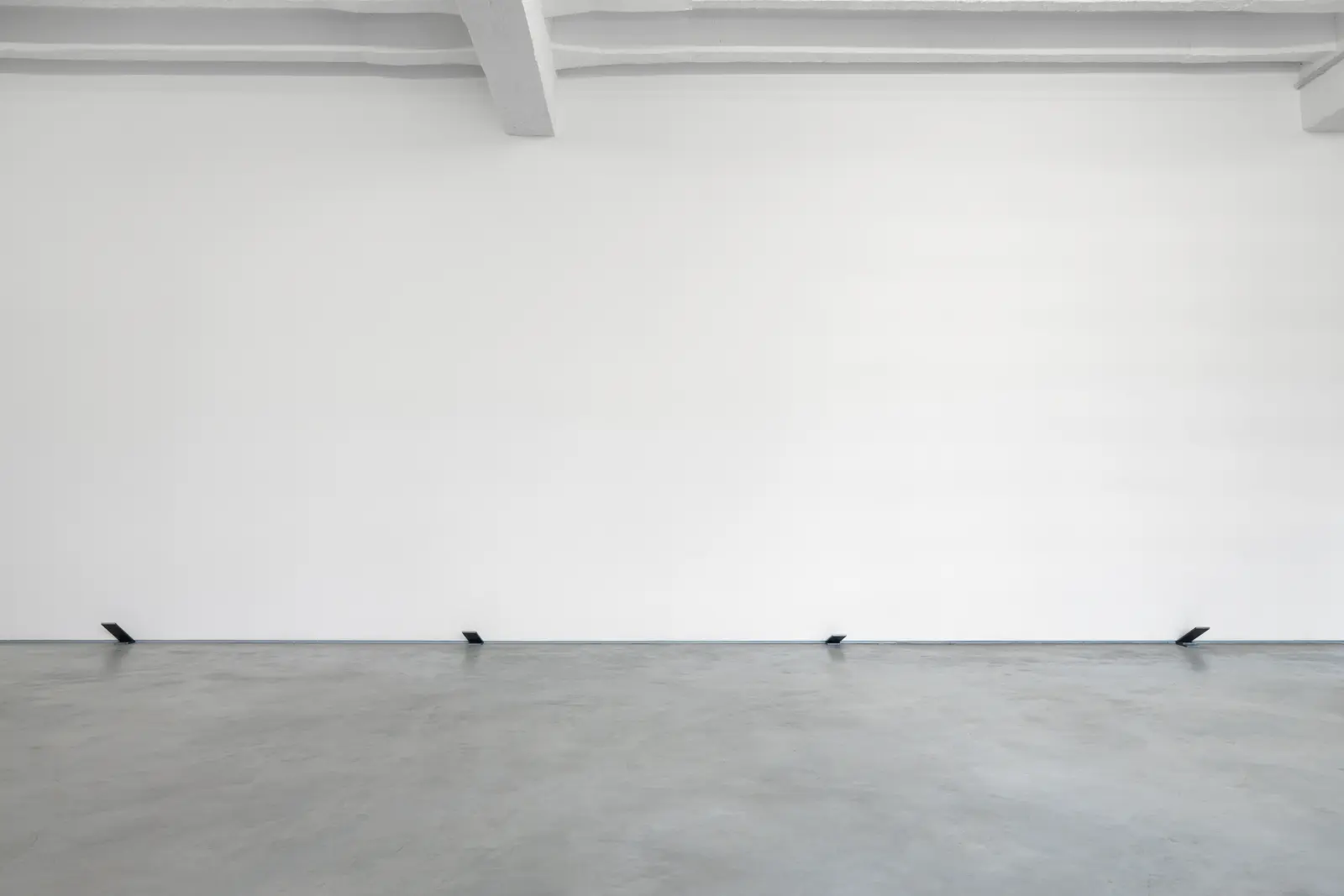 Steel wedges are placed in the shadow gap between gallery wall and floor, alluding to the possibility of cracking open the wall both in its physical condition as a wall and in its function as a hanging space within a white cube.