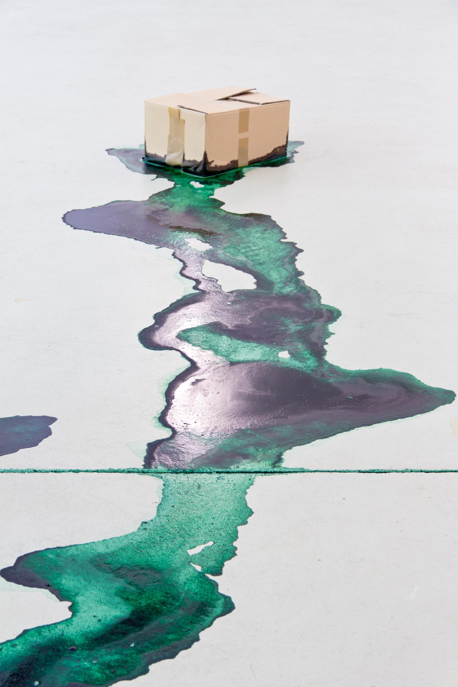 Popsicles made with food colouring are packed in cardboard boxes. At the opening of the exhibition, they are thrown into the exhibition.