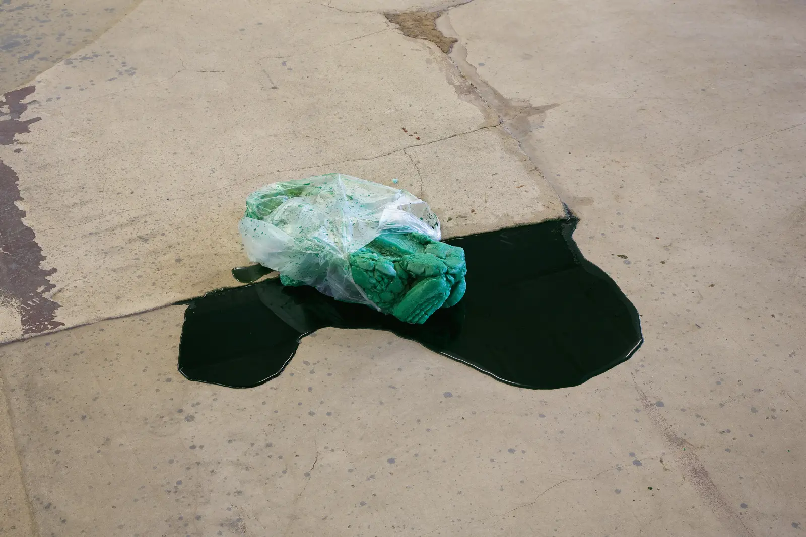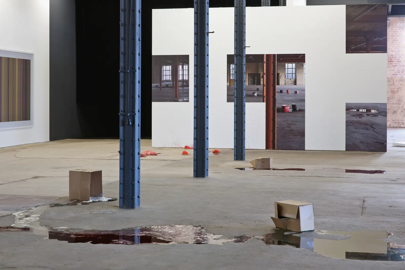 The starting point of the work is a specific situation in HALLE 14 at the Baumwollspinnerei in Leipzig. Ice-cream from a nearby ecological ice-cream shop is thrown into a defined range of the exhibition surface, demarcating an image field. Posters are hung on a partition wall behind this area, they shows details of the storey beneath the exhibition space, into which the melted ice-cream will drip through the ceiling. During the exhibition opening a city opening ceremony takes place on the building's roof, on the occasion of the renovation of the roof of HALLE 14, which was necessary due to water damage.