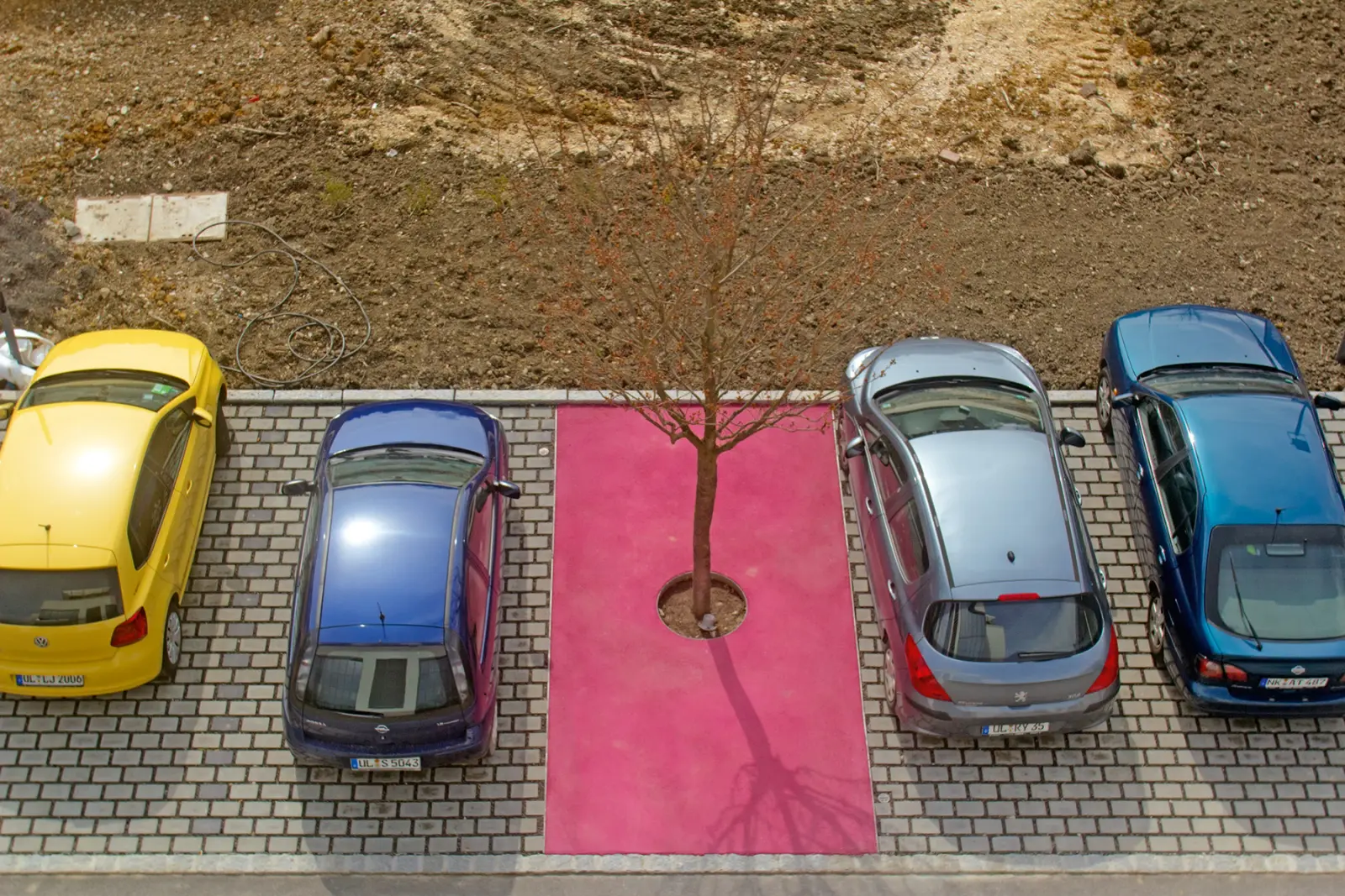 To indicate the transposition of tree location and parking space, the parking space by the courtyard and the area around the displaced tree are surrounded by pink asphalt. While the cherry trees bloom in intense pink in April, and leave a colourful carpet of blossoms behind afterwards, the asphalt is vividly coloured all year. The hue and life span of a plant is set against a man-made material.