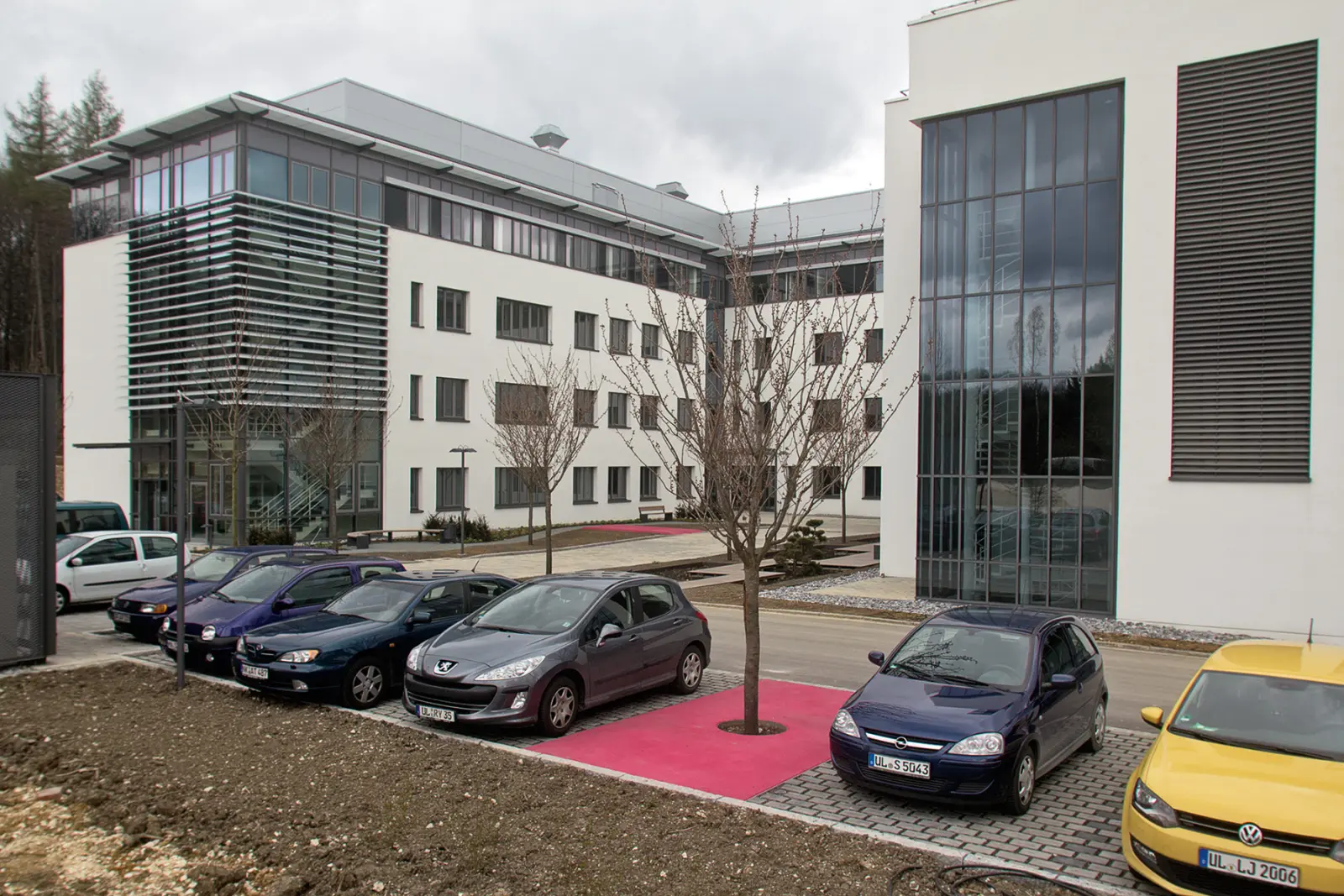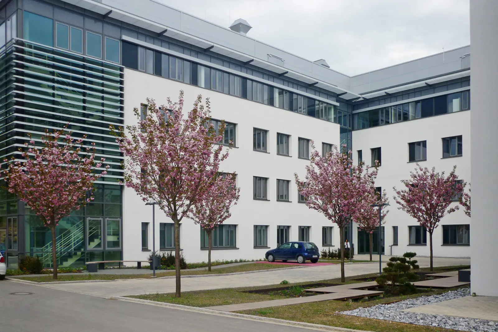 In the courtyard of the research building, at seven of the eight locations intended for the planting of trees, Japanese Flowering Cherry trees were planted. The eighth tree was given a location in a parking lot outside of the inner courtyard area. Conversely, this parking space was transferred to the location of the missing tree. Thus a solitary parking space is created directly next to the main entrance of the research building - by the way, this is the only free public parking space on the whole campus.
